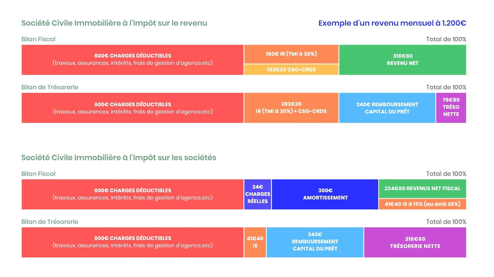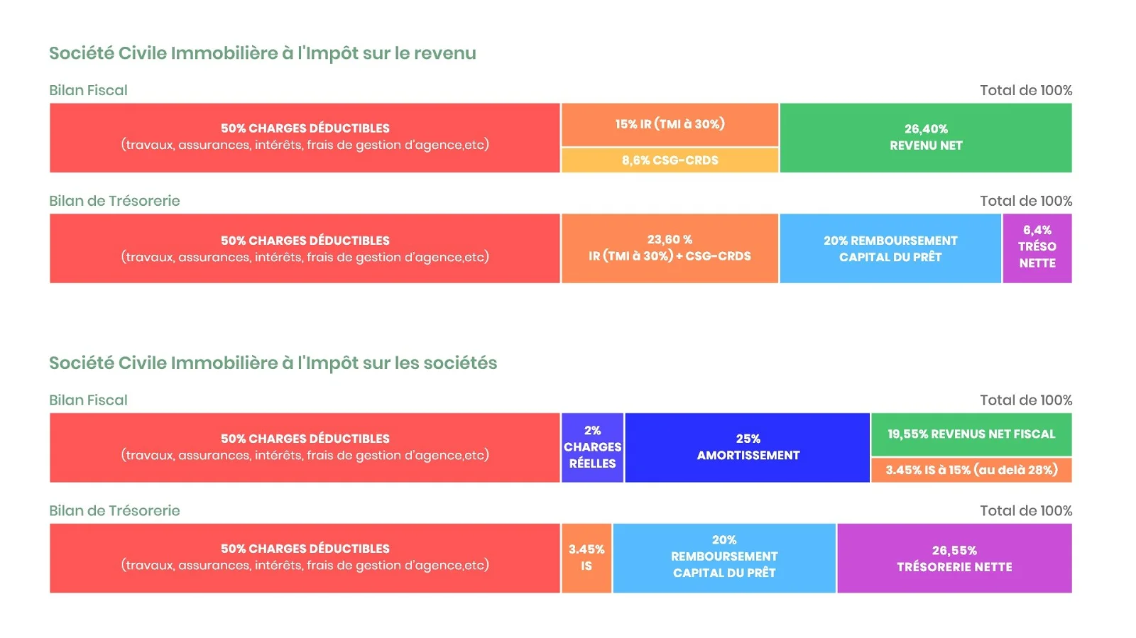 On l’a bien compris, la SCI à l’IS permet souvent de réduire ses impôts, les bénéfices étant taxés à hauteur de 15 à 31 %, selon les chiffres d’affaires réalisés. Pour les contribuables imposés sur les tranches marginales d’imposition supérieures de 30 et 41 %, l’imposition à l’IS permet de réduire sa pression fiscale, puisque c’est la société qui va supporter l’imposition. Les bénéfices d’une SCI à l’IR pouvant supporter une imposition à la tranche marginale de 45 % pour des revenus qui dépassent les 151 956 euros.
